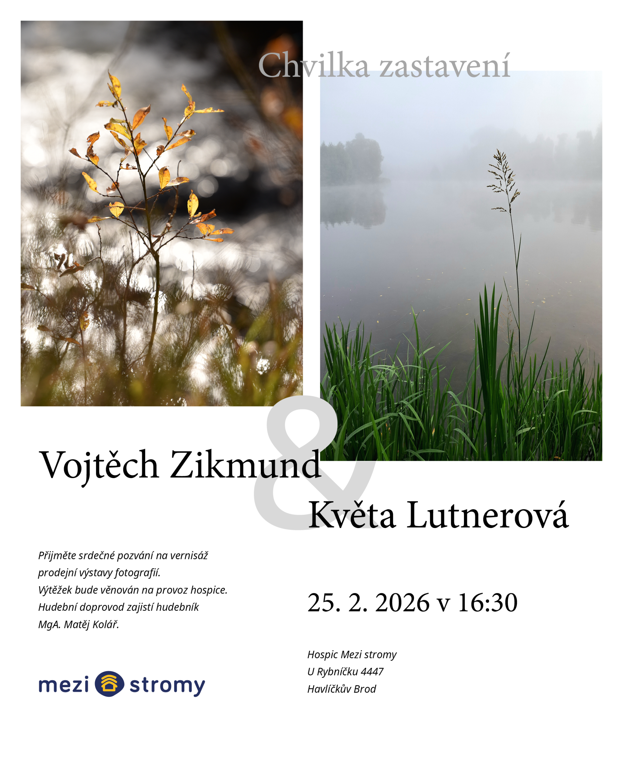 Srdečně Vás zveme na vernisáž prodejní výstavy fotografií, která nabídne prostor ke zklidnění, zastavení a propojení s uměním. Výtěžek z prodeje fotografií bude věnován na provoz hospice.